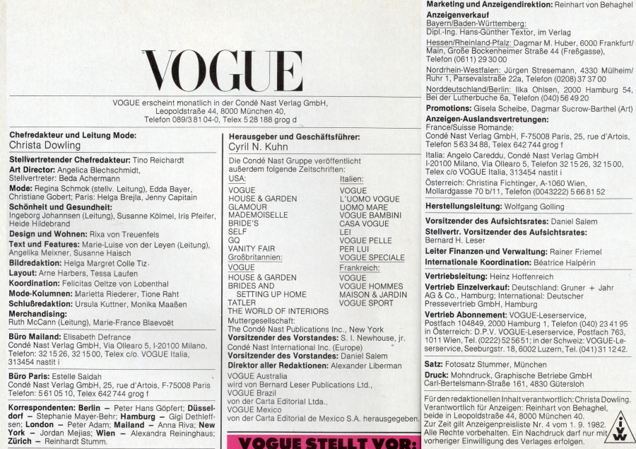 Picture Info : Vogue Deutsch - September 1983 - Masthead Credits