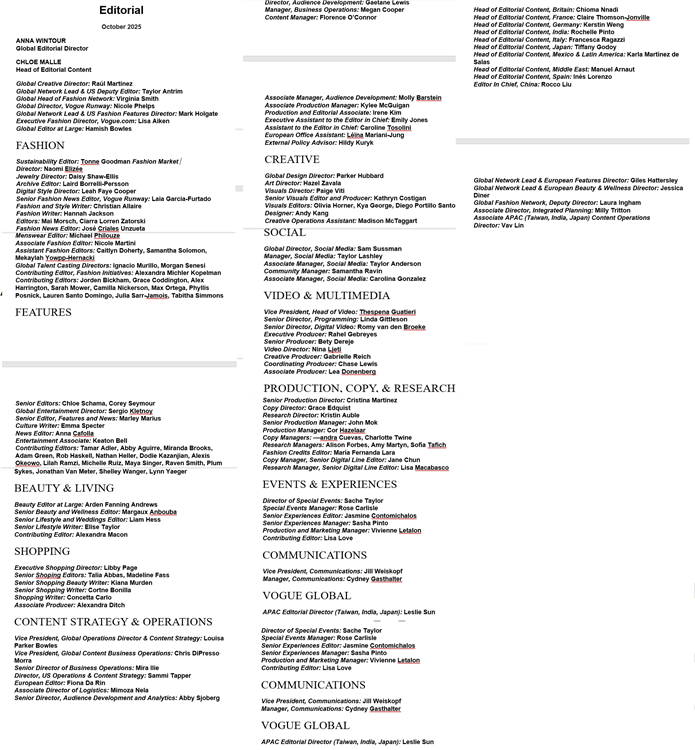 Picture Info : Vogue - October 2025 - Masthead credits as appeared on the website at the time of publication